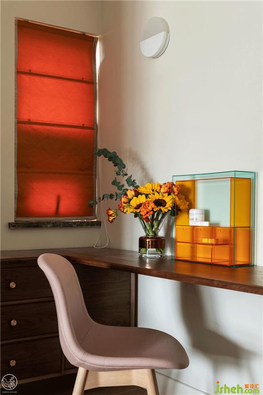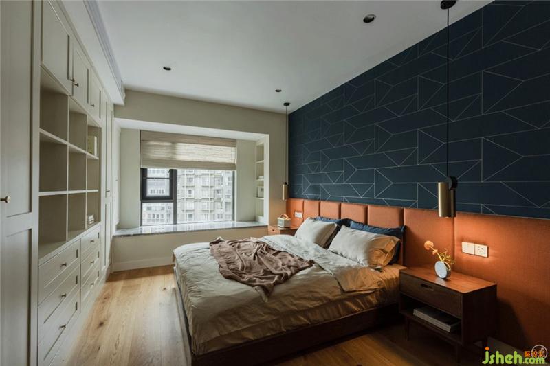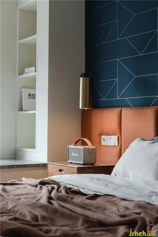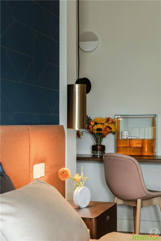 夫妻俩的卧室用了经典的蓝橙配色,偏深偏冷的蓝平和了跳脱扎眼的橙,一半是海水,一半是火焰。