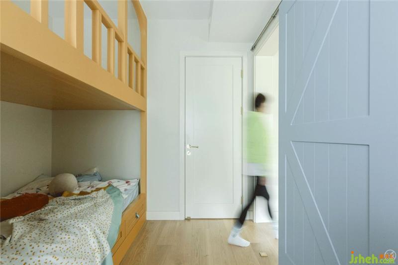 儿童房打通了两个房间,但睡眠区与玩乐区又以谷仓门分隔,并且在门的两面颜色上也做了不同深浅的处理,让小朋友能安心睡,也敞开了玩儿。