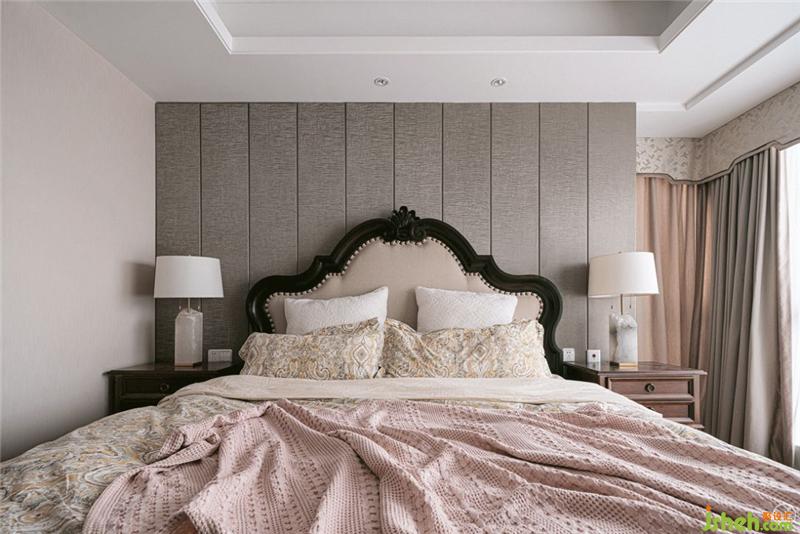 夫妻俩的卧室用了经典的卡其色系色搭配深色的木质美式床,颜色很好地相互衬托。