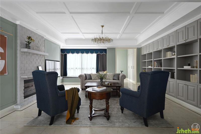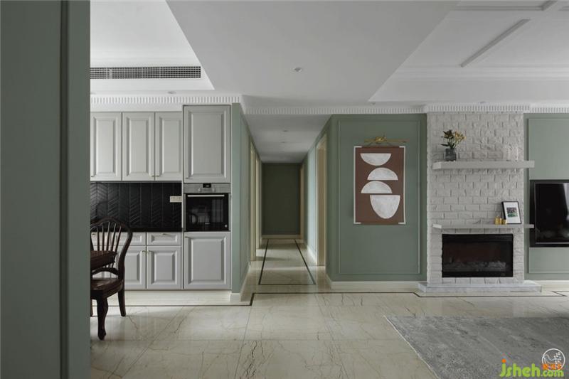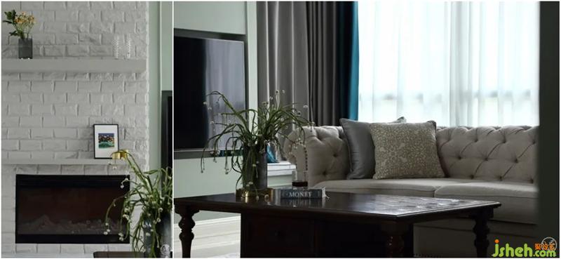因为Joan不期望将电视挂在壁炉之上,于是我们打破常规,以绿豆灰与白色从视觉及功能上分隔开了电视墙与壁炉。而银灰色的窗帘,则在壁炉映出温暖火光时,将原本清新、轻盈的氛围承托出温暖的归宿感。