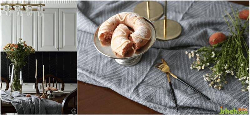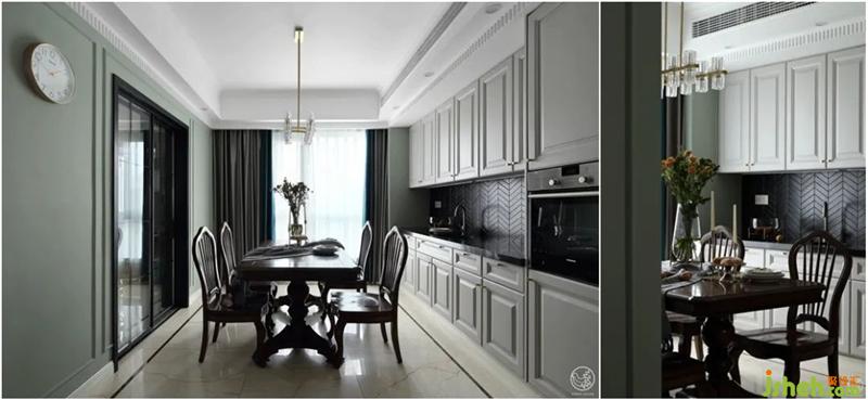 客厅与餐厅相连,相较于客厅整体偏轻盈的色彩基调,餐厅在延续的基础上,搭配了黑色人字形瓷砖以及深色的餐桌,让整个空间显得更为协调饱满。室内设计师