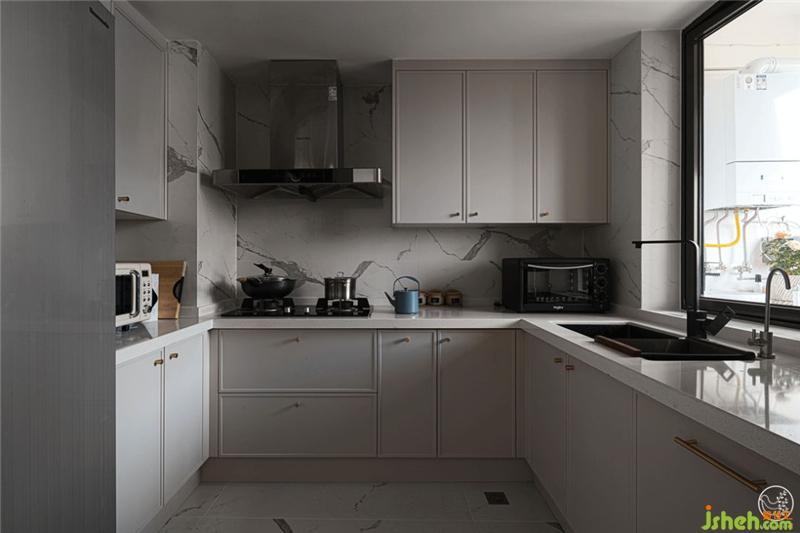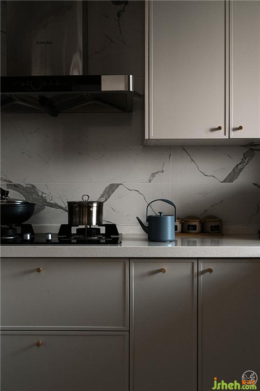 在扩宽了原始厨房面积之后,厨房与生活阳台以窗相连,功能布局合理清晰。墙面和地面延续了客餐厅大理石花纹的材质,让内外空间高度统一,为Gemini营造了舒适、合理的操作环境。