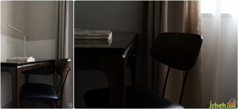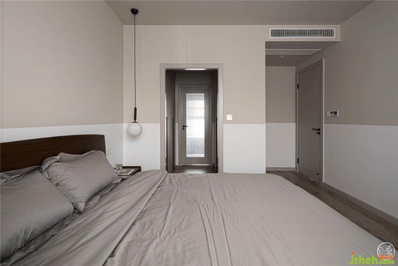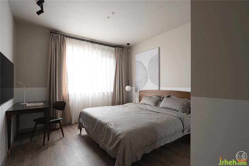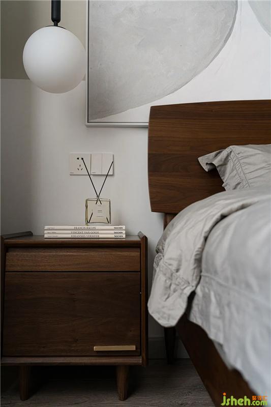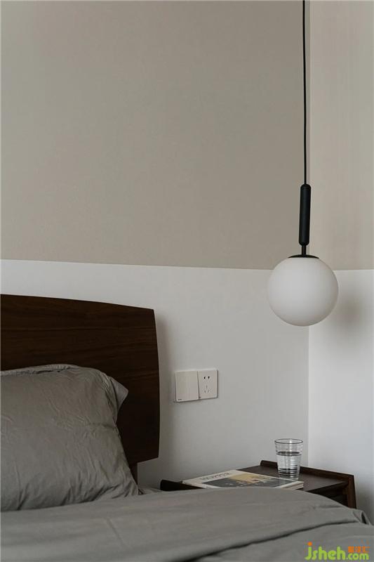 简约的卧室里,没有多余的家具,我们仅将一床、一桌、一灯、一椅、一柜简单融入浅灰色与白色拼色的墙面和温暖的棕色地板氛围之中,通过灰色、棕色和白色之间的碰撞,一本杂志,一杯咖啡,营造出温暖而又含蓄,理性而又温情的休息氛围。