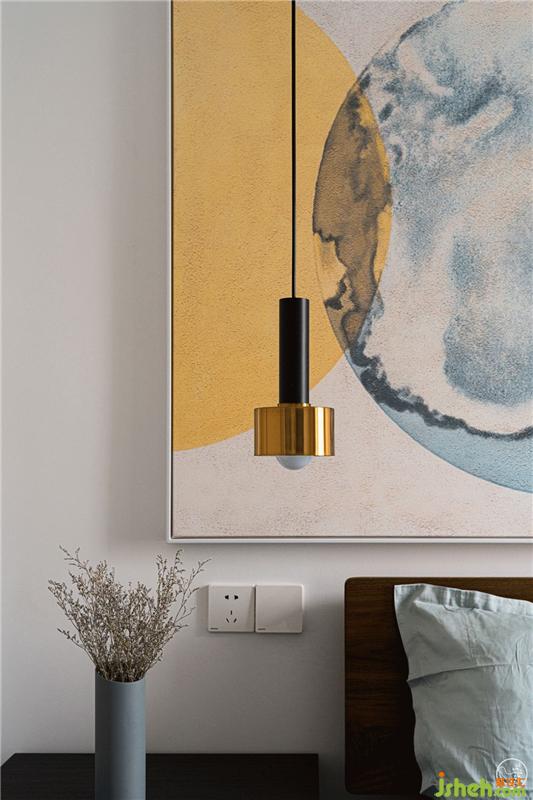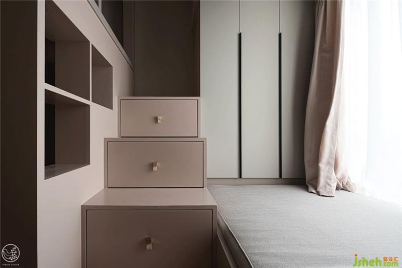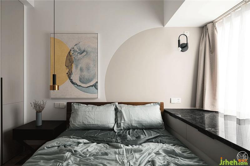 次卧因是父母居住,整体色调以白色为主,床头做了一个沙色的弧形拼色,搭配略为跳跃的水墨画,到顶的衣柜,简约又温暖。同时,为增加收纳空间,我们在飘窗处特意设计了一排抽屉柜。室内设计师