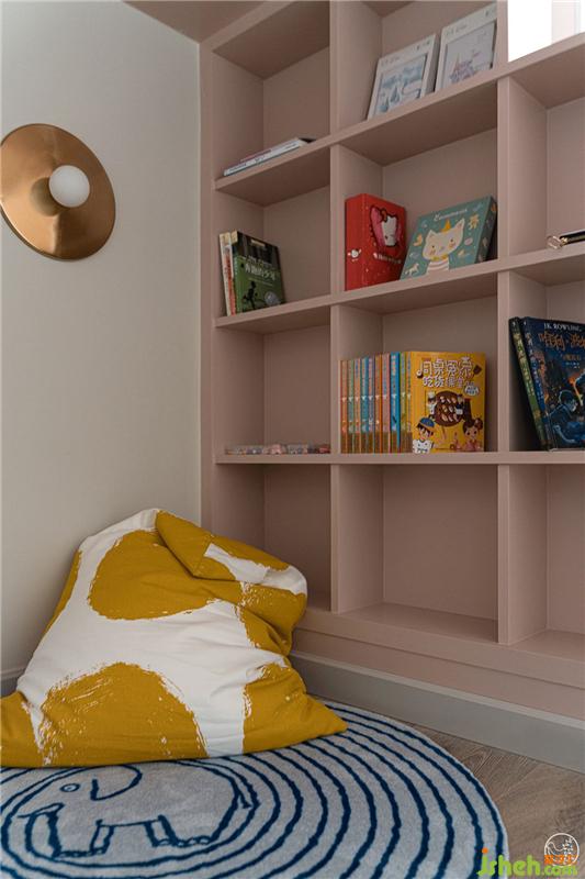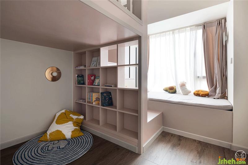 整个空间以藕粉色为主调,搭配干净明亮的奶油灰、趣味的圆形地毯,干净而有活力。同时为了给孩子更多的活动空间,我们设计了上床下空的结构,将床边的楼梯与飘窗台相连,留出下方的宽阔的活动、游戏空间,书柜镂空的设计,将采光与实用性兼具,同时也满足了小孩的休息娱乐的需求。旁边宽大的飘窗偶尔还可以作为卧榻使用。