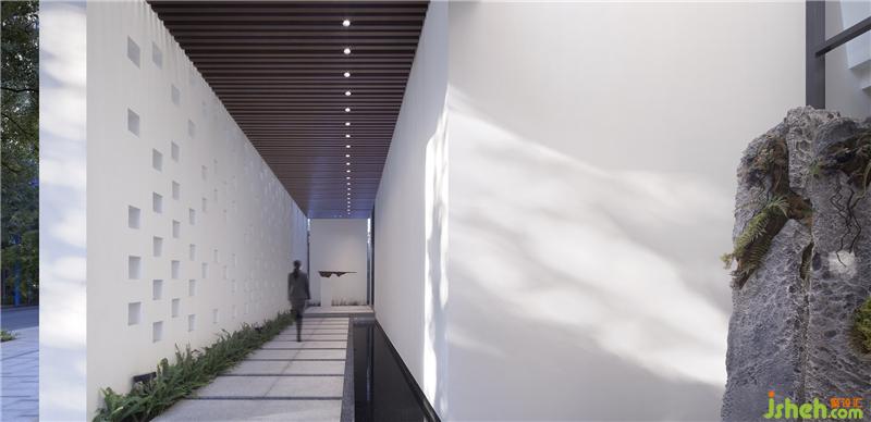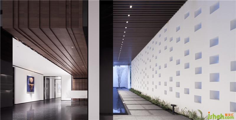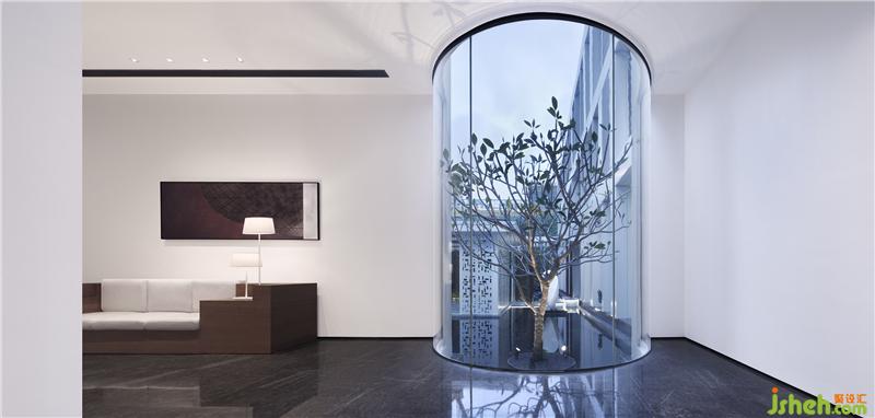 从入口开始,踏着斑驳光影的户外长廊,隔绝了城市喧嚣的幽静,铅华尽洗,已是别样的心境。到达过厅时,迎面正对的弧形玻璃内一颗生机盎然的树木静立水面,窥视下依稀可见内院景致,震撼中又给人带来某些期许。室内设计师