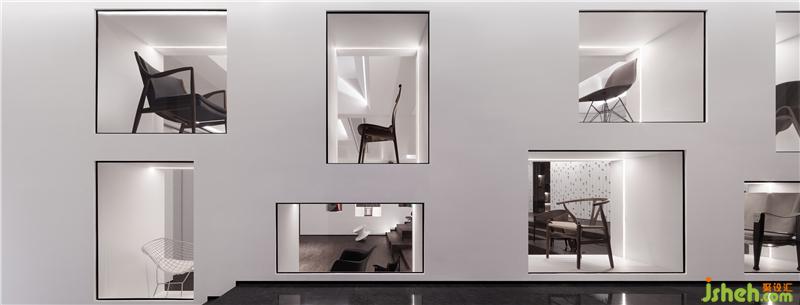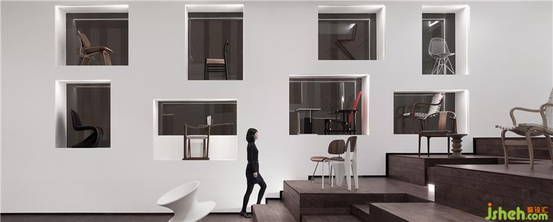 实体艺廊设于多功能厅两侧,同时也是几个重点空间的主要交通节点。在这里,设计师选取了和生活最为密切的器具——“椅子”进行展示,几十张经历岁月洗涤而沉淀下来的经典座椅既是空间展品,也是可以不断更换并体验的坐具,让体验者成为了经典演绎的一部分。