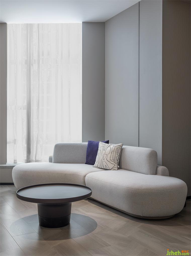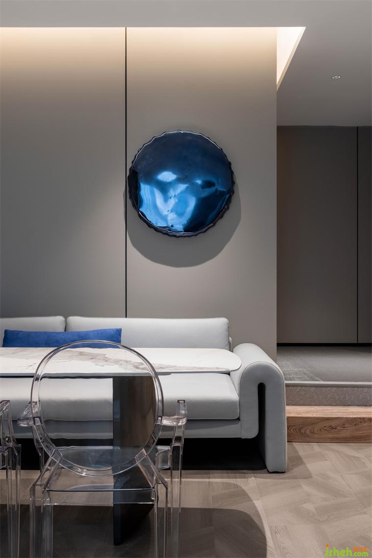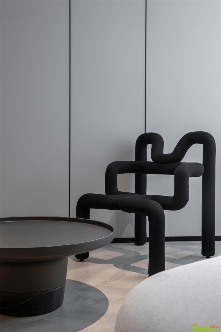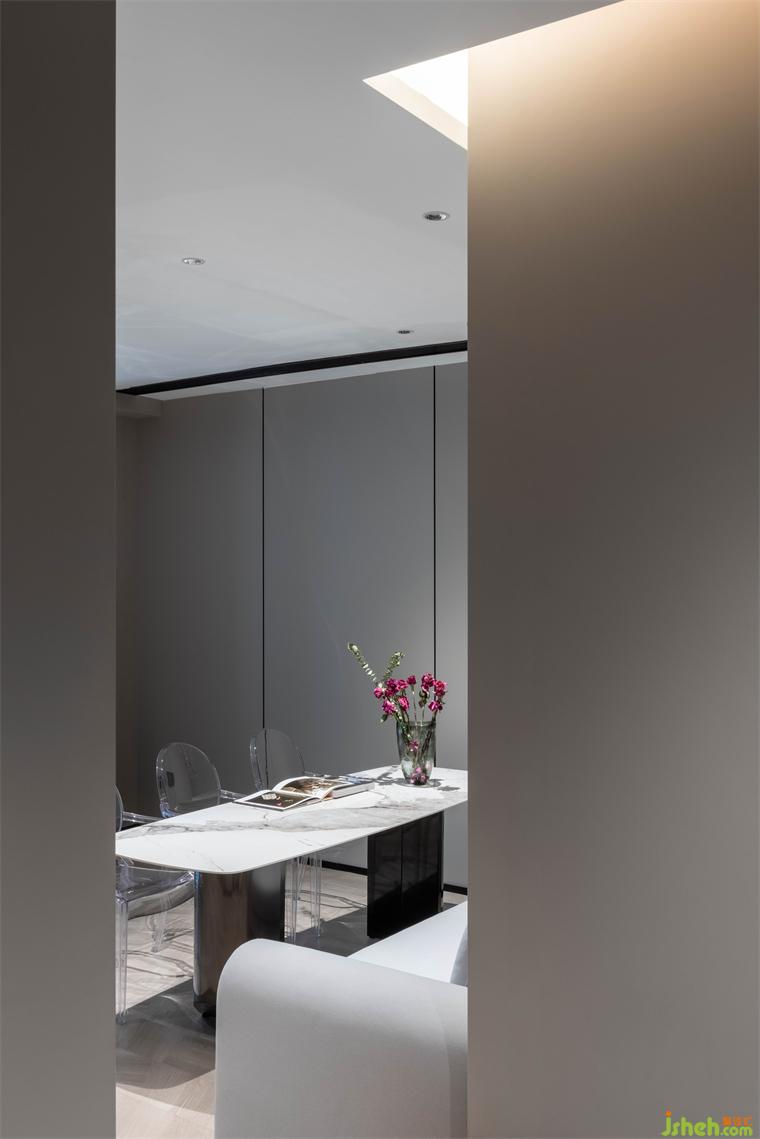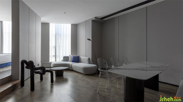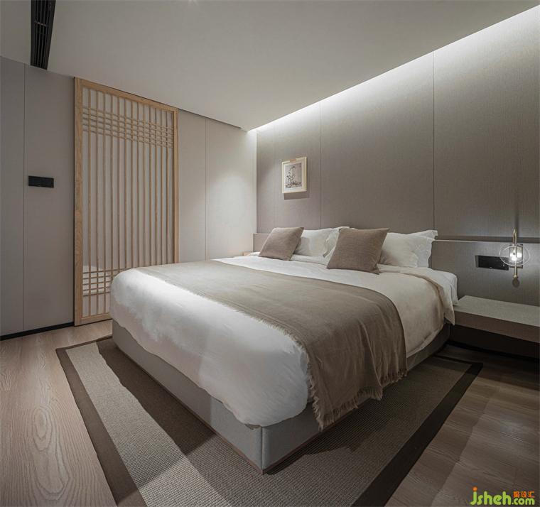 影青延续了传统青色体系,酒店设计以青紫色作为空间的基础配色调性。从墙面到落地的木质板块碳塑地板,低饱和度的浅灰色墙面护墙板,内里环环相扣,起承转折处,整体空间呈现雅致美感。