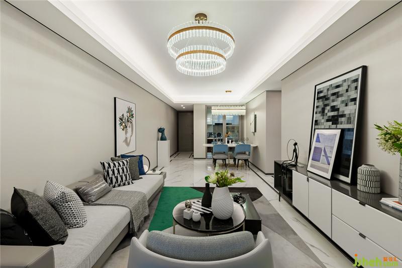 客餐厅并置的公共空间,7.6米进深,具备大空间的舒适度和大气感。蓝色和古铜水晶灯在空间中映衬出生活的喜悦和温馨,餐具杯盏散发出现代时尚的味道,几何体块和线条结合,构成简约却耐人寻味的艺术品。