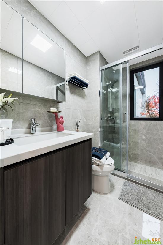 卫浴空间分区明确,区域之间在使用过程中互不干扰,功能齐全。设计师依旧秉承雅致简约的设计理念,地面和墻面沿用同色系瓷砖,意在刻画空间的大气和时尚,并从视觉上拉大了空间的尺度。
