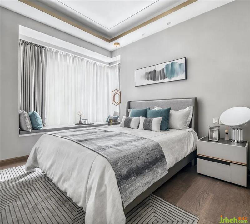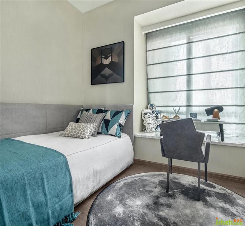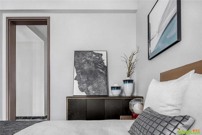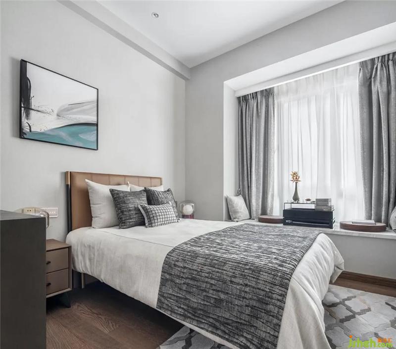 次臥也是壹如既往的舒適簡潔,亞麻色的軟裝搭配讓臥室氛圍更加樸質,样板房设计使整個環境更加精致出彩。