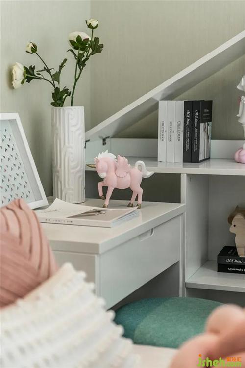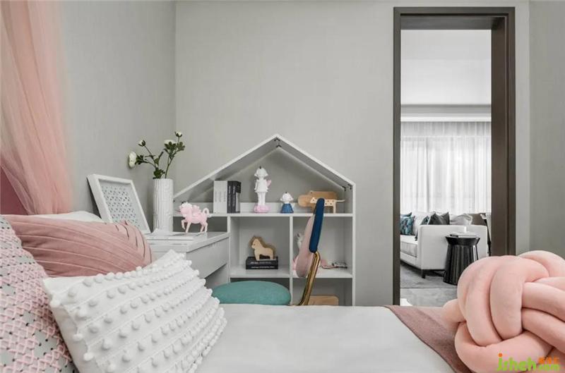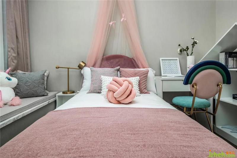次臥借由甘石粉的優雅浪漫表現新生代的生活訴求與價值態度,彰顯主人的個性。隨意的軟裝布置,增強空間品質感與藝術氣息,藝術與幾何的碰撞,打造壹個充滿戲劇性的個性、溫暖空間。