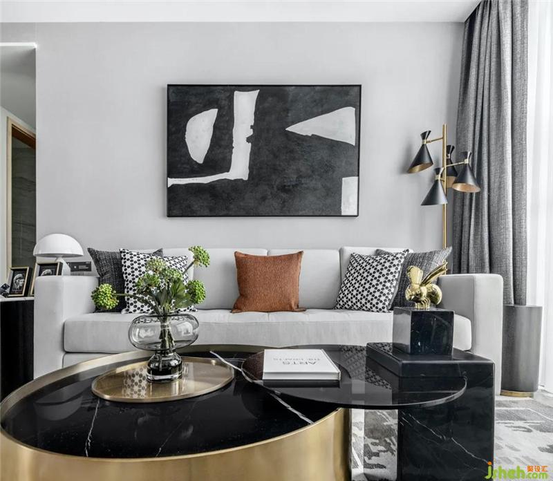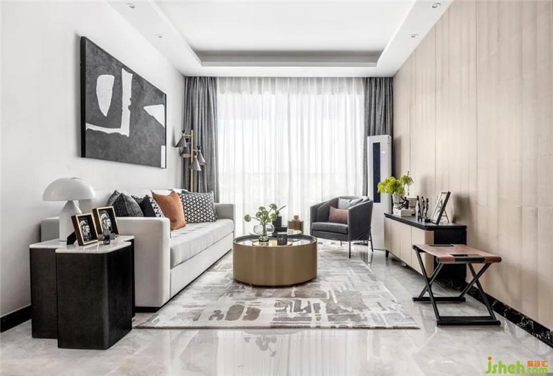 客厅空間簡約大氣,地面的線條勾勒,幹凈利落的家具,精致的軟飾,錯落有致,精致和諧,配以色調與紋理表現力極強的地毯,局部搭配石材的家私飾品,細節處不時運用金屬線條鑲嵌等些許元素提升意境,使生活多了壹份品味和關懷,營造壹個蘊含現代輕奢的品質空間。