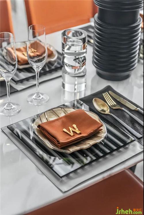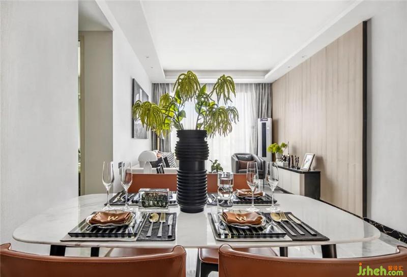 餐廳右側墻面木飾面為立面增添了層次感,餐桌與立面的色彩自然融合,精致的餐具是美食的好搭档,享受一日三餐的味觉归属。质感軟裝材質和色彩與客廳呼應,壹抹綠意點綴出了餐廳空間中自然雅致的氣息。