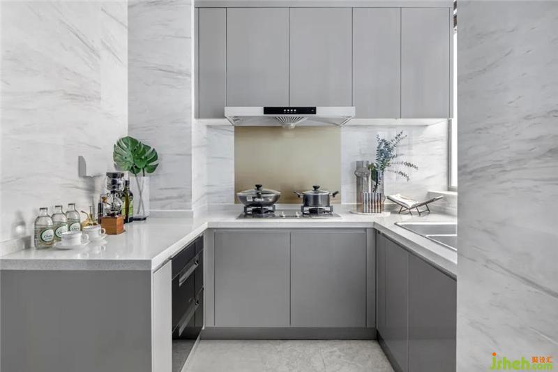 厨房的墙面使用了大理石质感瓷砖,浅白色的干净配色让整个空间更通透。左侧台面,布置了趣味的摆件,造型圆润的花瓶增添了整个厨房的活力。