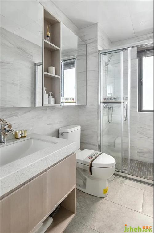 大理石質感的衛生間很幹凈通透,大理石瓷磚墻壁與暖調儲物櫃相得益彰,样板房设计直邊鏡子展現了利落的直線感,豐富空間的視覺效果。