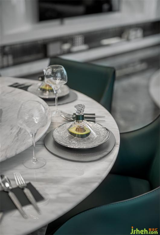 大量的金屬元素協調硬朗的大理石,样板房设计整個空間宛若璀璨的首飾盒熠熠生輝,引人側目。吊燈設計來源Mathieu Lehanneur,手工製作的黃銅燈具是一個自我表達的現代照明聲明,優美的線條並不是設計的全部,與自然和諧相處是設計必不可少的,憑借前衛的精神,兼具功能的精致和優雅的簡約。