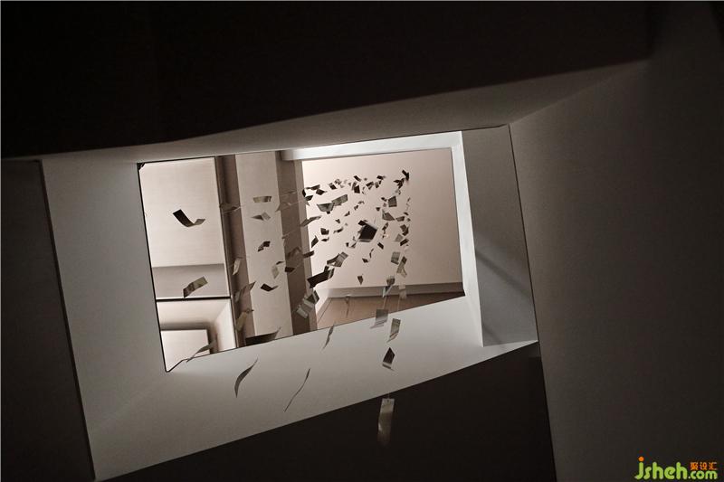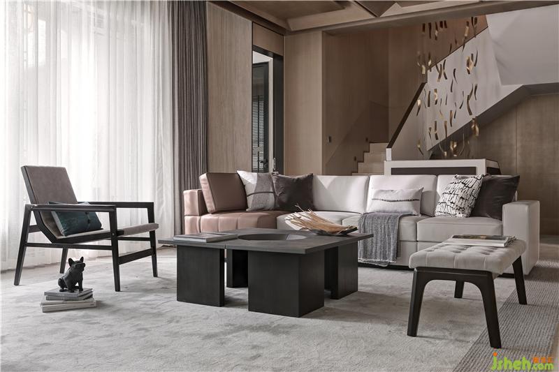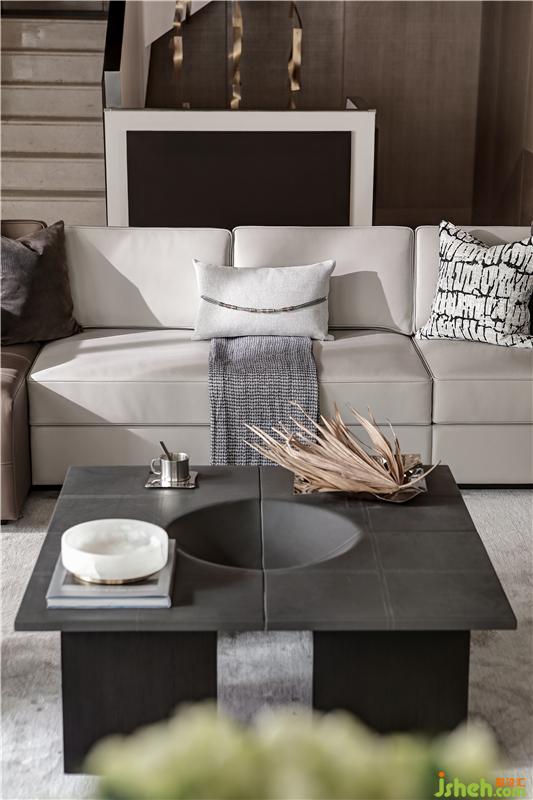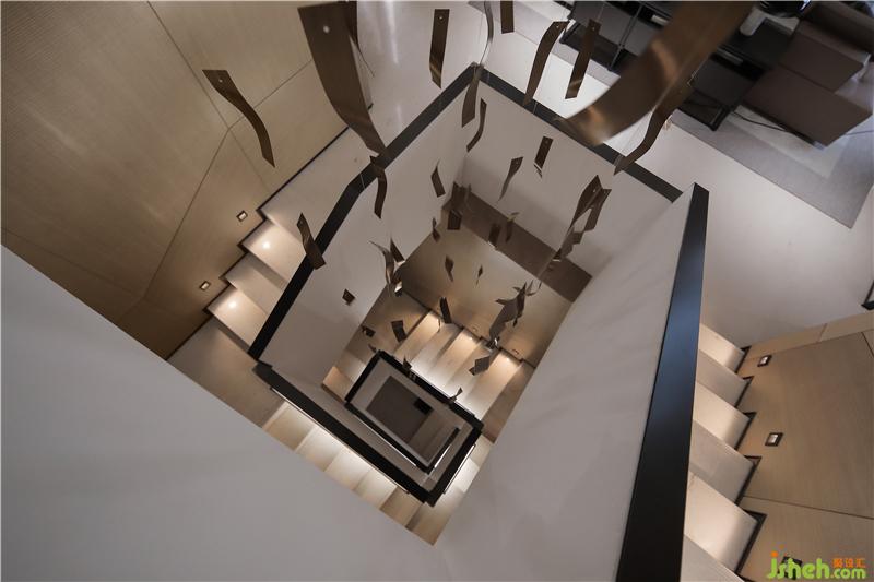 楼梯灯光设计选择了更为人性化的点光源,从墙面透光到步梯,均匀分布,光感温和、温馨。一条以铜片为素材的手工艺术装置轻盈如飘带,贯穿别墅四层的楼梯天井。几何硬朗与灵动轻盈,形成对比反差,也让空间生动起来。