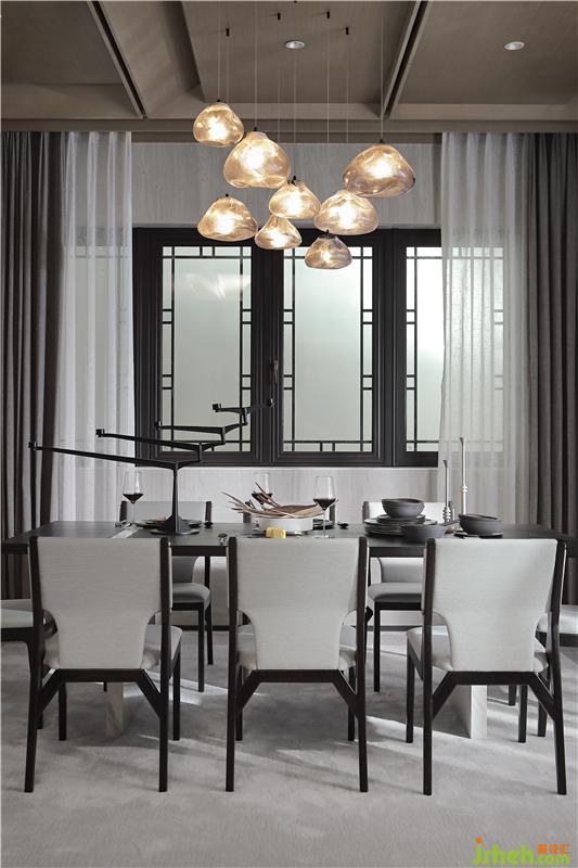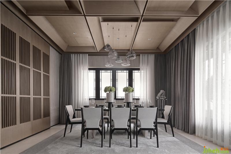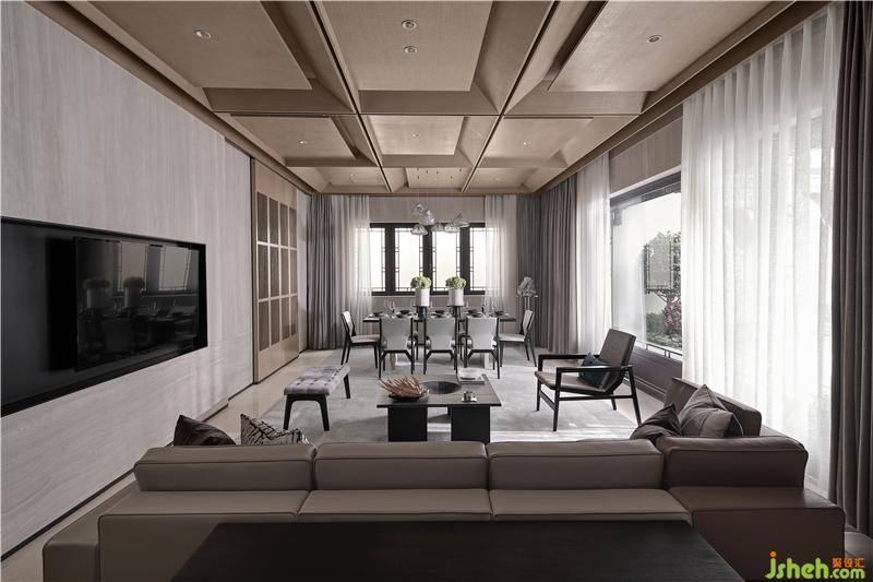 室内公区天花提炼中式梁架结构和坡屋结构,将其简化为经典九宫格木构造型,用现代手法演绎中式韵味,天花与墙面在色调上的呼应统一,强化了空间在视觉上的延伸感。一层作为生活起居空间,样板房设计将客餐厅与室外完全打开,将更多的自然景观引入室内,模糊室内与室外、建筑与自然、人与自然的边界,交互形成,浑然共生。