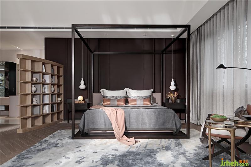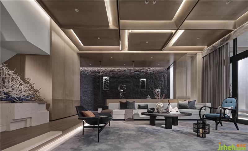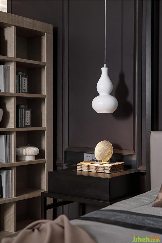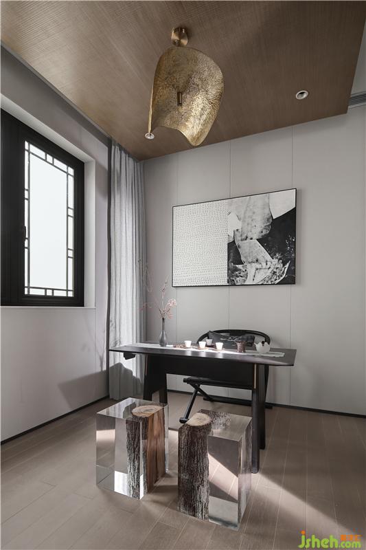 饮茶在岭南文化中占有重要的一席之地,茶室意境与书房不同,更具传统意韵。样板房设计黄铜铸造的吊灯如荷叶自然写意,主人椅点亮主旨,客凳则由铂晶树脂与原木融合,东西交融意味十足。