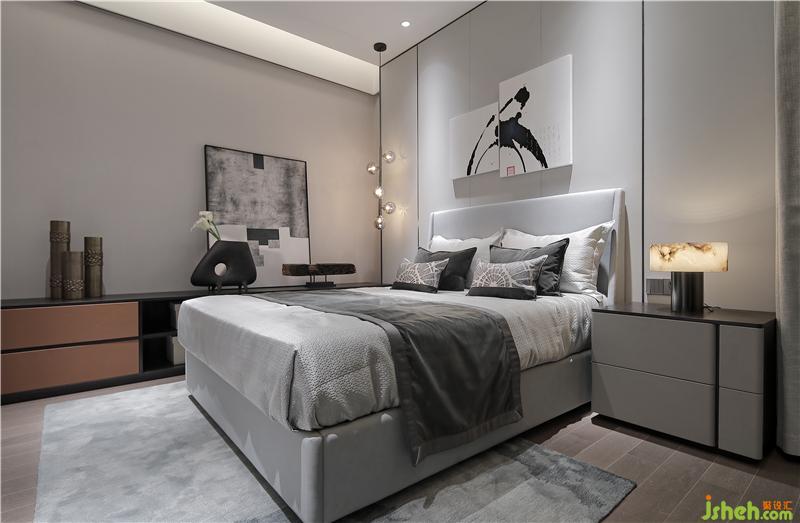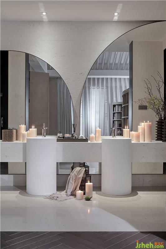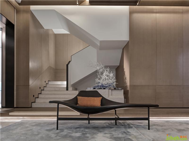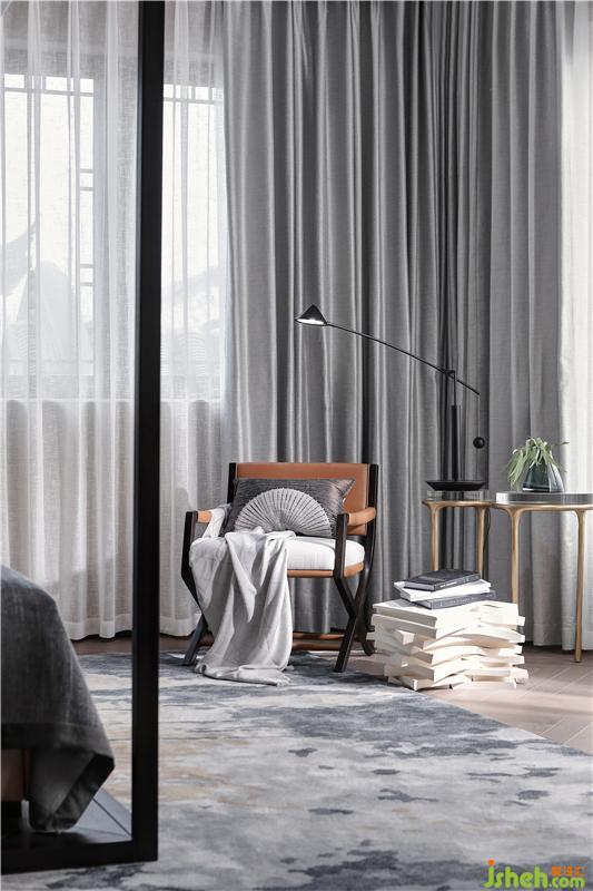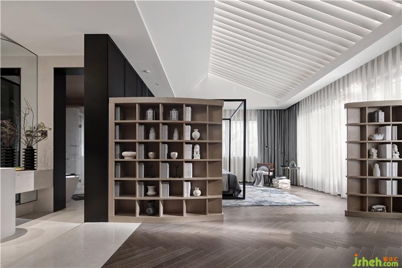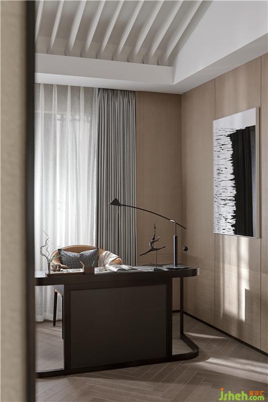 二层作为休憩空间,样板房设计融合书房、衣帽间及浴室作为整体配套设施,以“梭”为形式设计的柜体天花,唤起童年时代的记忆,天花模拟自然天光,去除装饰光源,营造自然舒适的睡眠环境,休息区面朝户外景观,将自然揽入怀中。一把舒适的皮质单椅,一盏意式极简台灯,周末午后,拉开窗可见窗外怡人的雅典园林景色;或是疲惫一天后,关上窗帘,开一盏灯,翻阅几页林语堂先生的《生活的艺术》,陶情遣兴。