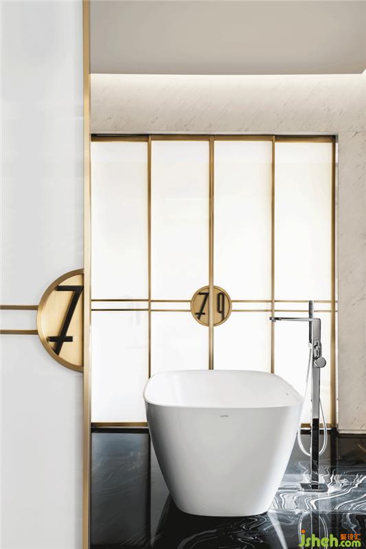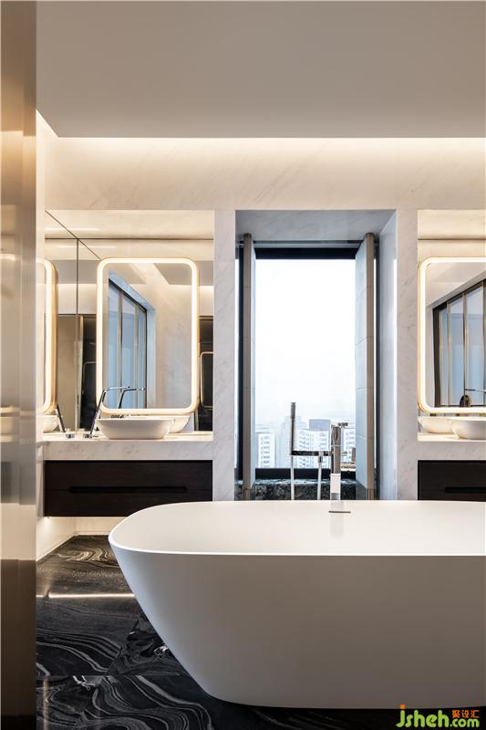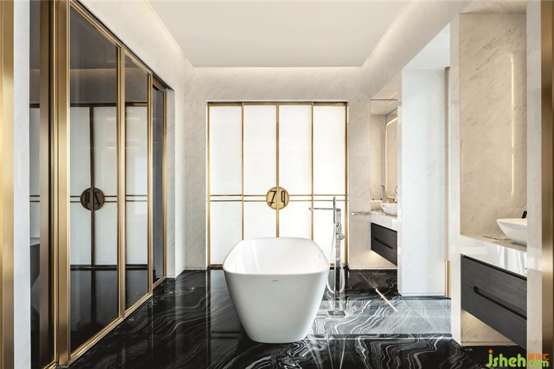 连接套房与展示区的主卫,亦是一个可变换的连接模块。套房、展示区、会客区的位置可根据主人的需求喜好,对调、变换——整个居室的动线,都具有一种开放的可变性。此外,主卫的浴缸别具趣味地被安置在空间的中央,这样的巧思亦出自我们在与万科团队交流的过程中,对项目操盘者生活灵感的采纳。