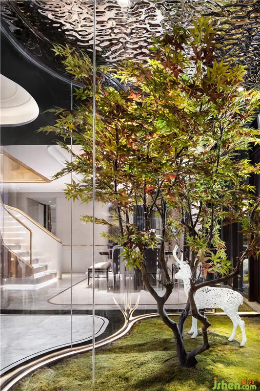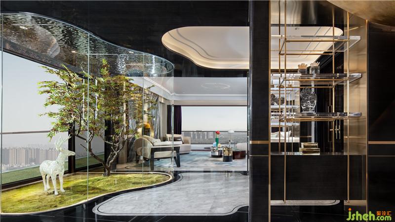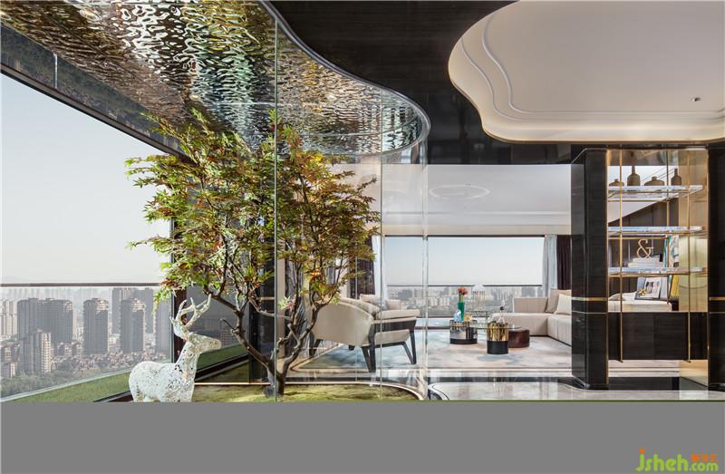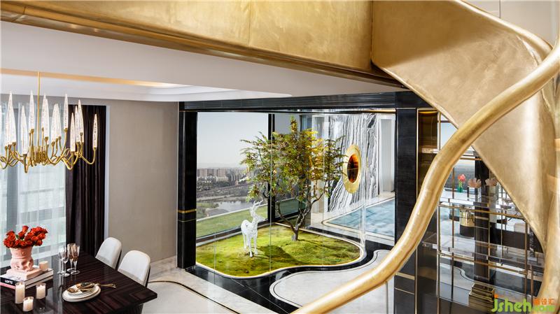 挑空Lounge bar,上演着爵士时代觥酬交错、宾客迎门的沙龙景象。对于都会新贵们来说,酒是都会生活中意趣的触媒,然而,本案中的酒廊,却又营造出凌空阔景的尺度。自然景致的贯透,使得整体的空间开阔、自由。对都会新贵们来说,都会夜生活的情致,少不了夜色与星空为伴。