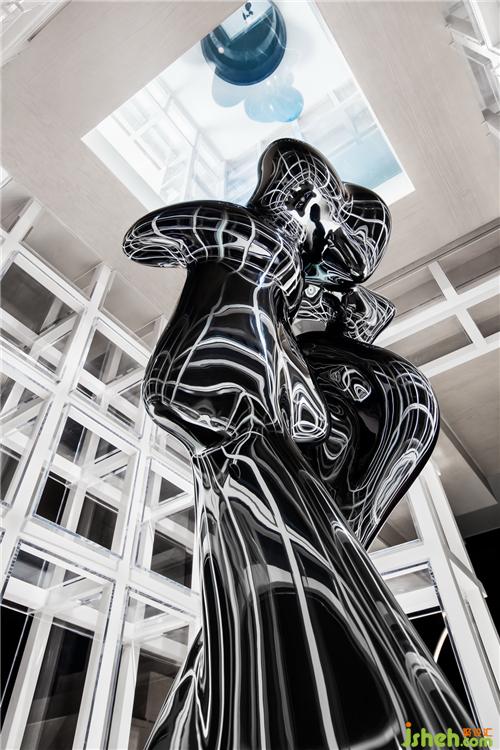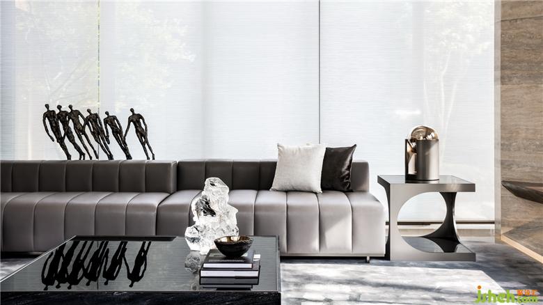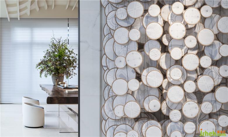 主要材料:雪花白石材、银灰洞石橡木染灰、方管烤漆、亚克力、镀钛灰、黄铜、喷漆、壁纸、皮革