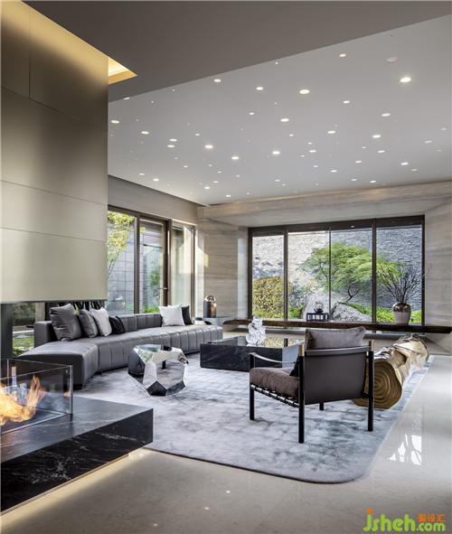 这是一个庭与园共生的当代别墅,似一副传统与现代和谐圆融的「双面绣」。若以地面划界,便可直白地将耦前别墅一分为二:地上两层是「离」,打散建筑,以供自然「见缝插针」;地下两层为「合」,整合空间,以便自我意趣有序铺陈。平面的中心处,客厅是首层动线的汇聚,是垂直交通的汇聚,亦是庭院景观的汇聚。室内设计师