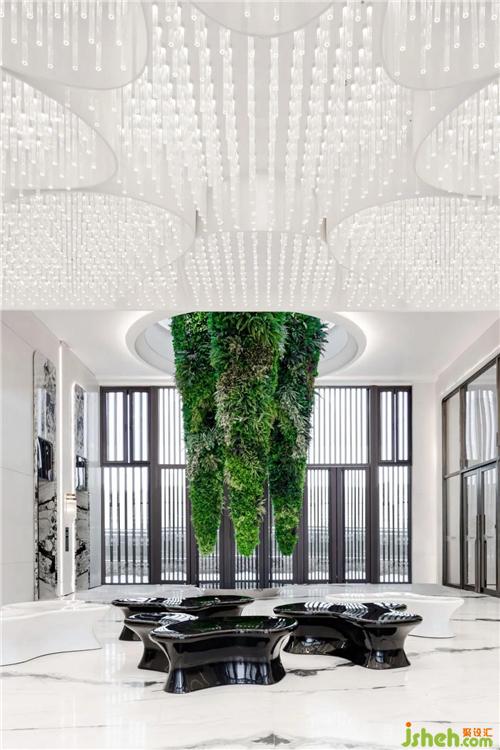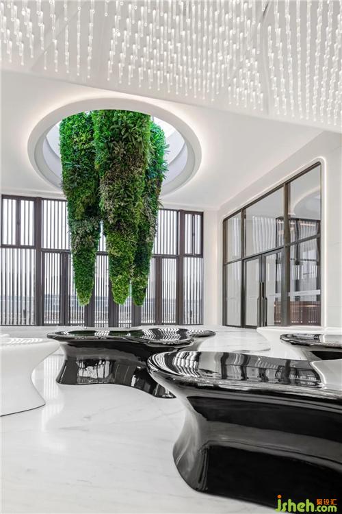 花瓣散落,在地面集聚成具备座椅功能的艺术装置。黑与白并置,正如万物的两级彼此渗透、幻化,界限不清;其形态又似是泉汇而成潭、聚而成湖,将自然予人的喜悦与惊奇再现于会所的方寸之地。