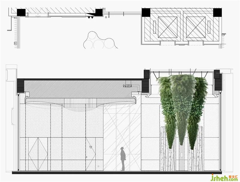 基于原始空间结构,我们以梯厅横梁为界,将首层大堂一分为二。顺着梯厅顶部的圆形天窗一组绿植装置垂下,如同山林反向生长;北京会所设计自然光与灯光成为设计的「材料」,天空与室内的边界模糊朦胧、恍惚如梦,形成一种超现实的气氛。电梯框的绿色石材,让「山林」的故事更加完整;访客沿着地面「行云流水」般的石材,换上惬意的心绪与步调,进入空间的另一侧——「花」的世界。
