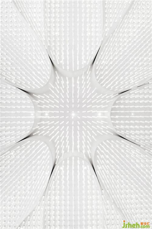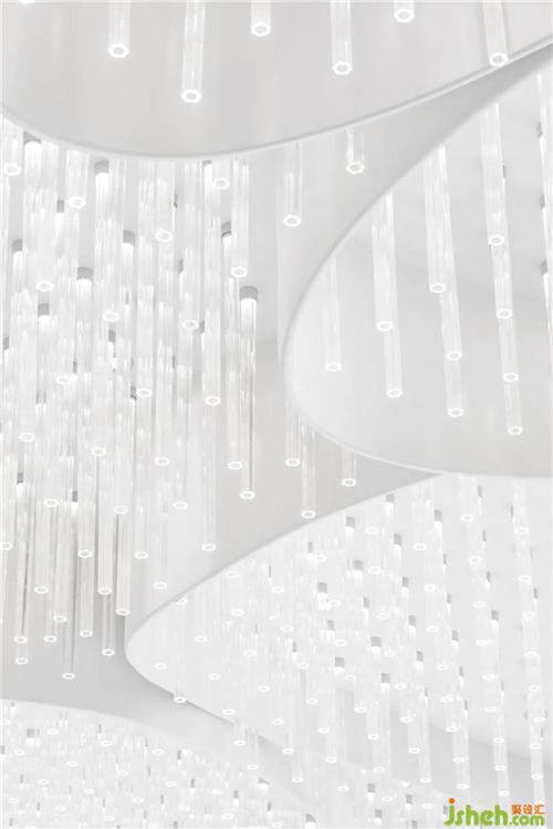 天花开出一朵悬于头顶、尺度恢弘的「花」,以强大的张力诱惑人抬头仰望,遥想生活中的美好。设计对「花」的引用并非具象,而是希望藉由形态的相关诱发心境的回响。伫立其下仿若置身花中,梦幻与现实相混、人与万物一体。北京会所设计描摹「花形」的无数水晶玻璃棒正是连接记忆的无数纤维,点亮整个会所空间的想象。