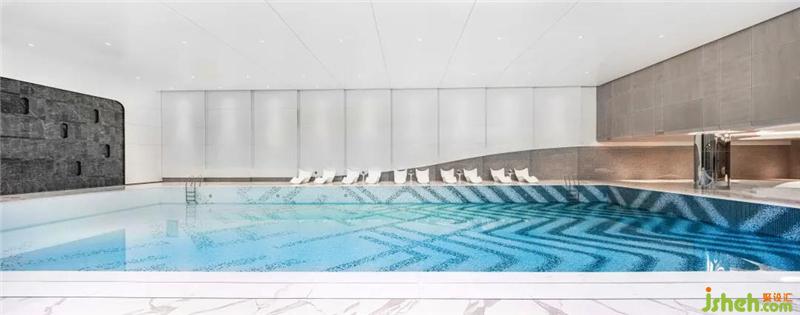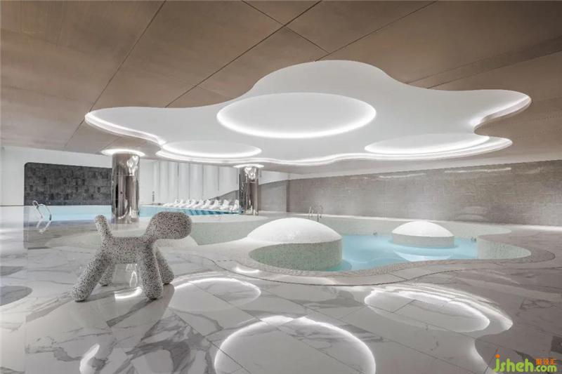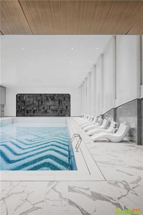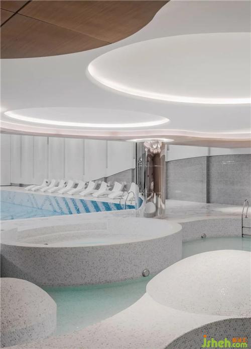泳池空间,建筑原始结构有两排柱列,颇具古典空间的仪式感,却与整体的基调有所差异。我们希望采用更为抽象、当下的设计语言去重塑空间氛围,留出「想象空间」的一隅之地,让人能够脱离现实的桎梏,浮游于万物原初的混沌。依托空间的L型结构,我们划分儿童区与成人区,并用材质的变化来弱化柱体结构、丰富空间的层次。
