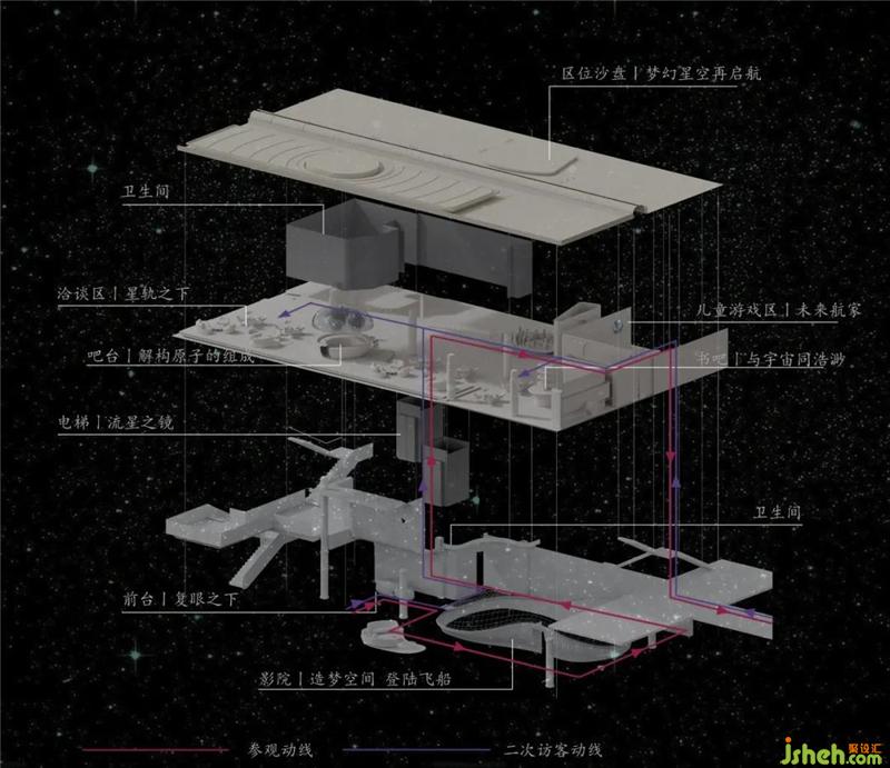 建筑的临江面利用悬挑结构、承重柱内退,三层空间成为最大体量,打造出「漂浮盒子」的意向。沙盘、洽谈、水吧等功能空间就势布置于顶层,在没有明确边界感的物理空间中,时间与秩序发生轻微震荡。室内设计顺着建筑的侧窗引出一条银色金属带,东西贯通整个空间,配合灯光模拟出天窗般的感受,让室内再度「漂浮」;不锈钢穿孔板留出的白点串联成银河,奠定了「天际星海」的空间主题;正对电梯厅的水吧台以手打镜面镀钛金属板包裹出半球形,如同某颗星球爆炸冲击而成的碎片;垂直向度,圆形的天花与其轮廓相对,又一圈圈荡漾开来,留下冲击波震荡的痕迹;由亚克力与金属构成的吊灯则记录着宇宙碎片随机、无序的运行轨迹……关乎宇宙爆炸的遐想编辑出「天际」的序章。