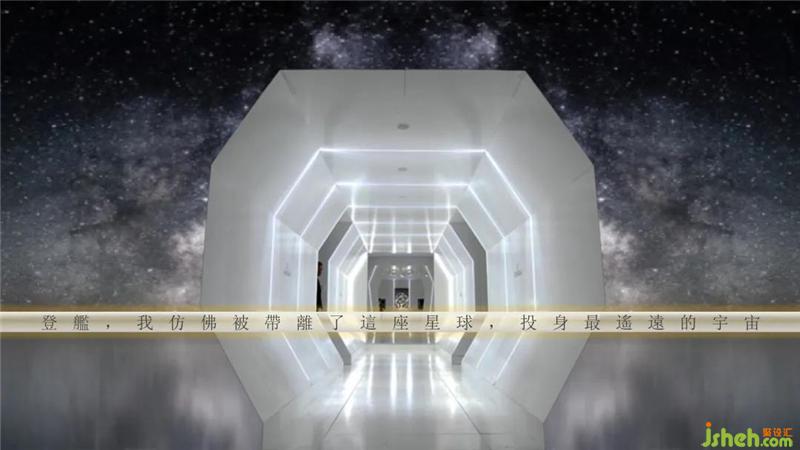 事实上,「宇宙」是规划、建筑、景观与室内设计诠释「天际」不约而同的关键词:建筑向北,滨江而立,顶纳群星、底接水域,是售楼处,更是「星际会所」;景观设计则于池中设一座模拟「日晷」的银环,并用太阳谱系墙来传递对宇宙时间的理解。通体透明的建筑让室内成为城市「橱窗」中的展品,我们希望它能具备诱惑人心的力量,吸引每个经过江畔的人为「天际」而回头。