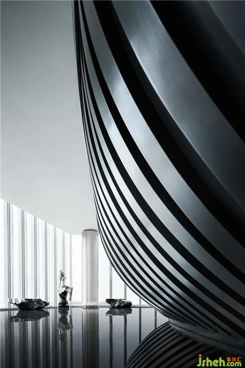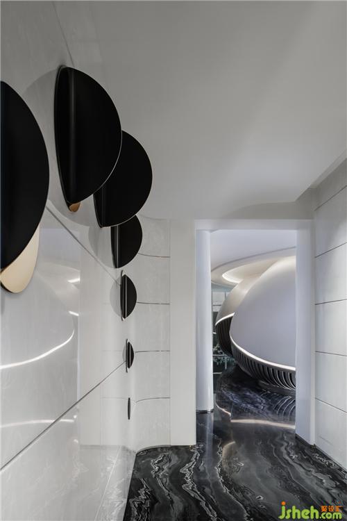 * 电梯厅丨墙面用黄铜材质,打造「月相」,将艺术融入空间;不远处的「飞船」则是对空间艺术化更加完整的表述