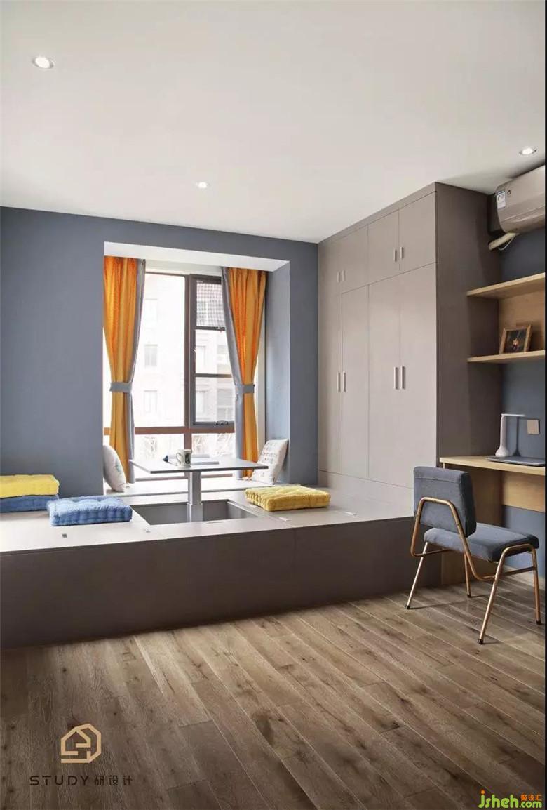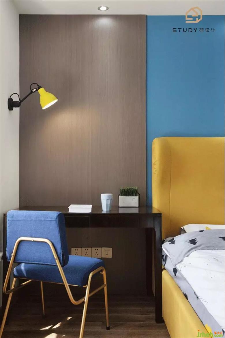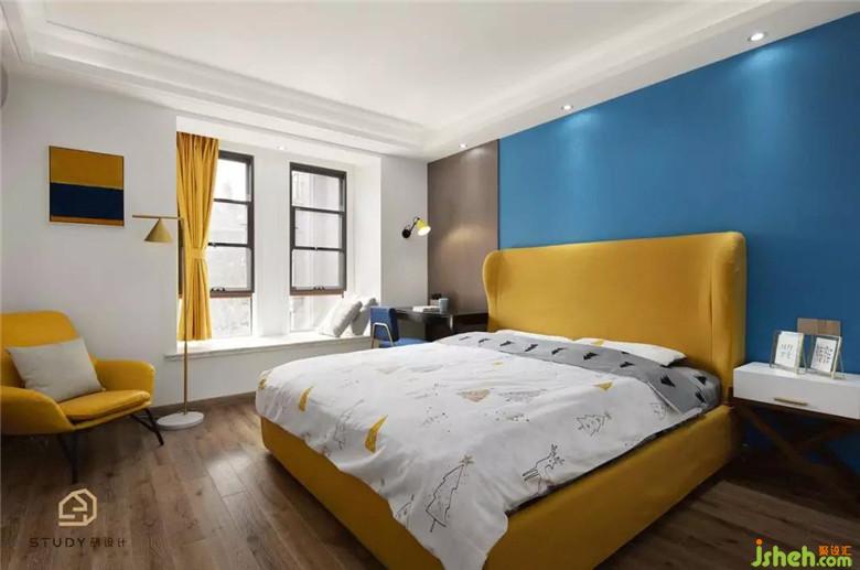 卧室室内设计师选用了蓝色的壁纸作为背景色,而床就是用黄色的点缀,让空间显得温柔,舒适。