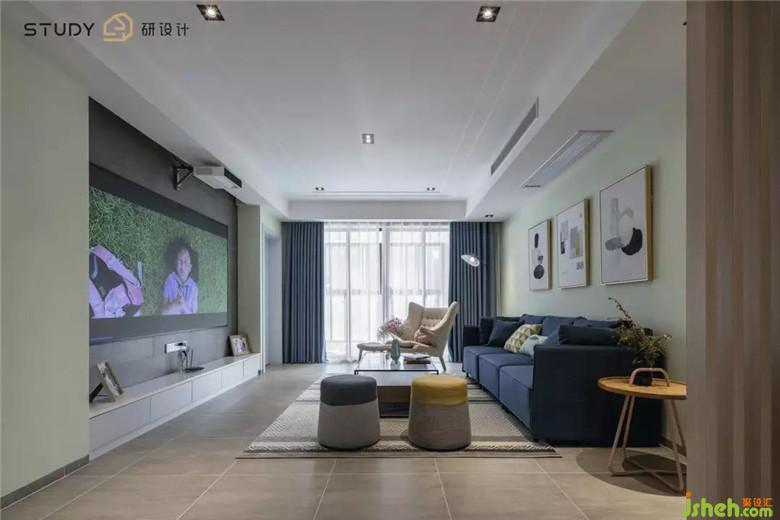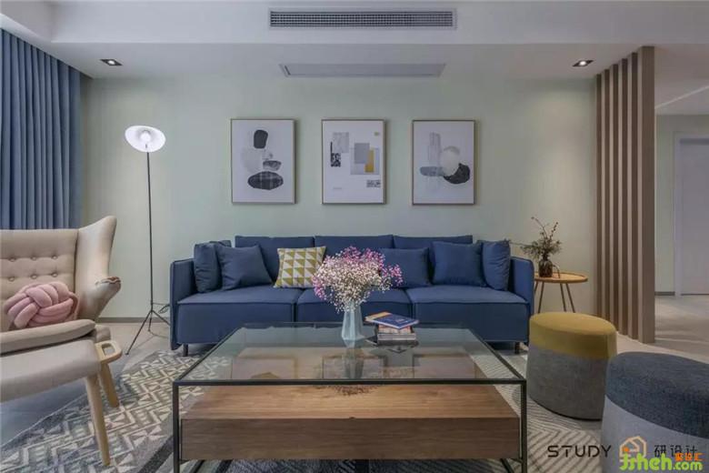 客厅作为待客区域,背景也以浅色为主,室内设计师在软装搭配和家具上体现的淋漓尽致。客厅中间宽大的主沙发厚重、舒适,海军蓝作为主沙发色,也成为整个客厅的点睛色,鲜明有活力、有生命力。