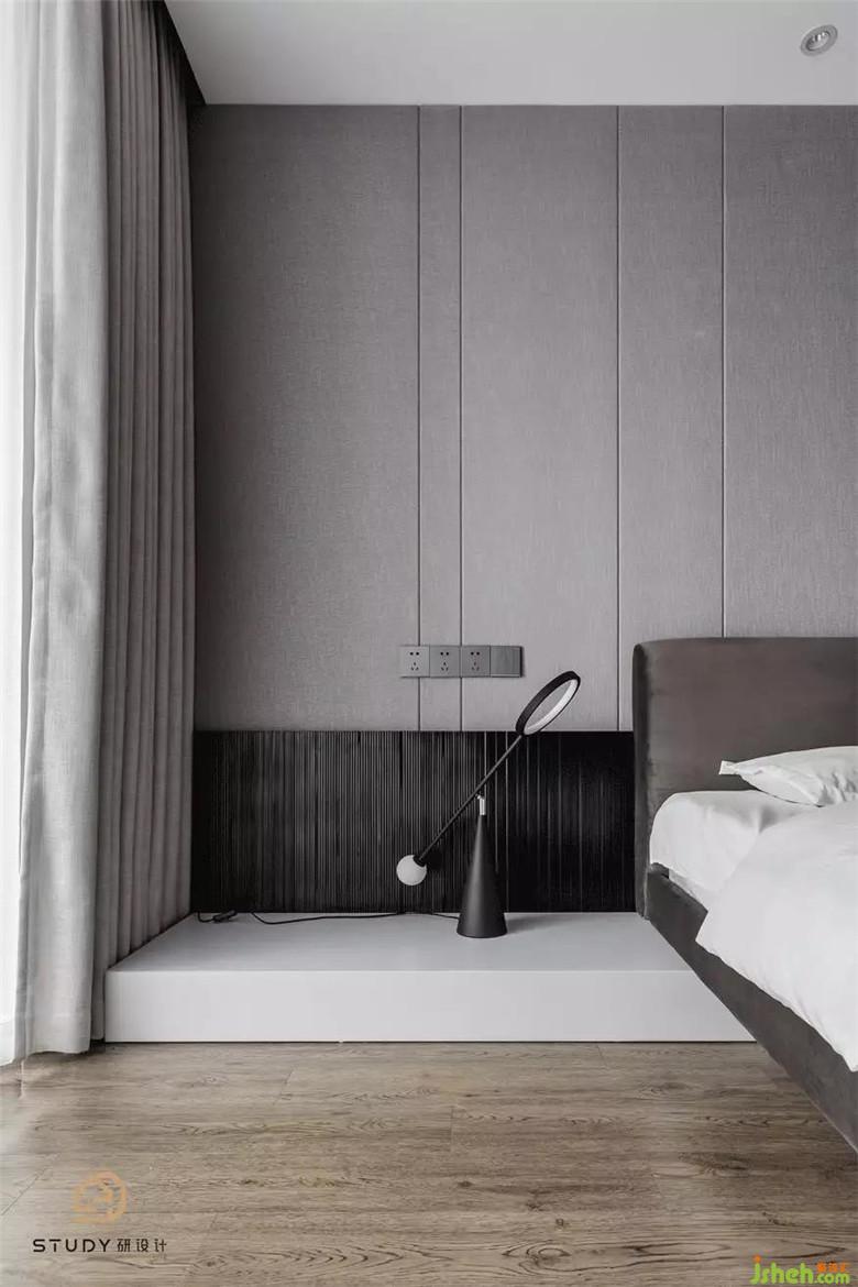 主卧空间配色以冷色调为主,有助睡眠,定制的寝具和床头柜搭配充满设计感的台灯,高级感充斥着每一个角落。