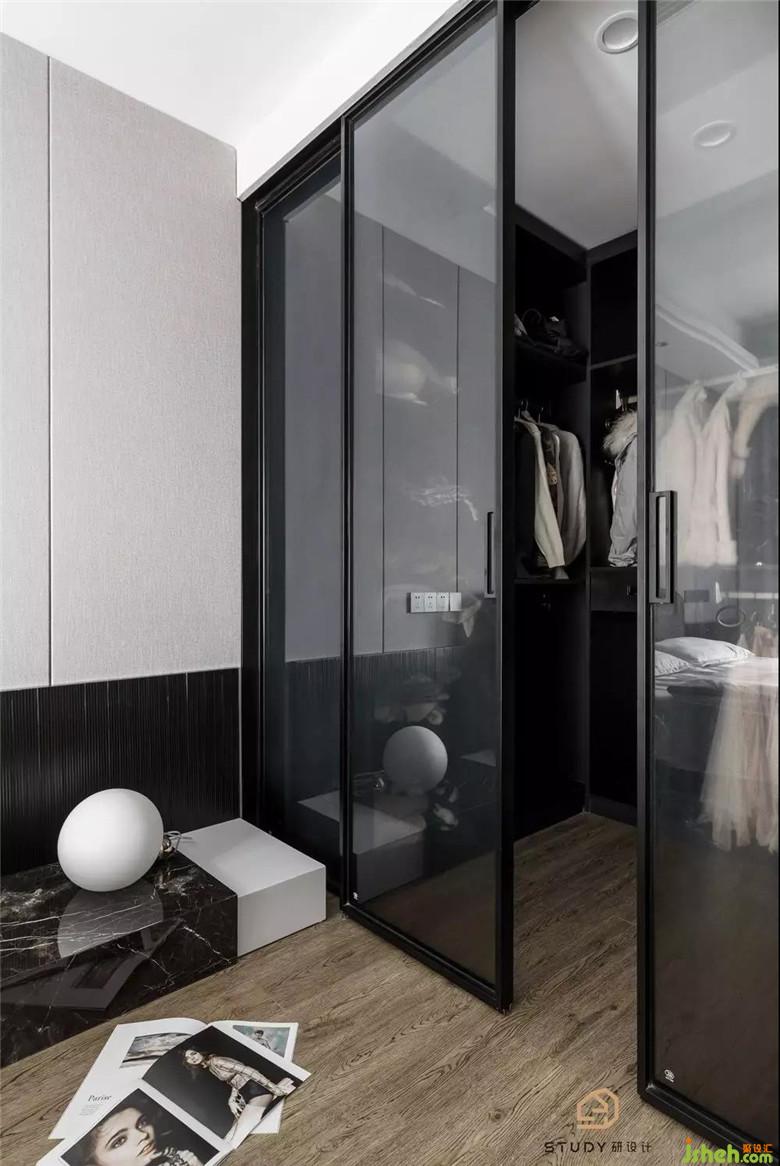 深灰色夹丝玻璃是在广东定制并由本地拼装生产,对于每一个材料细节,都容不得将就,它与黑色定制衣柜的组合更像是一处秘境,勾引着初次见面的人去一探究竟。