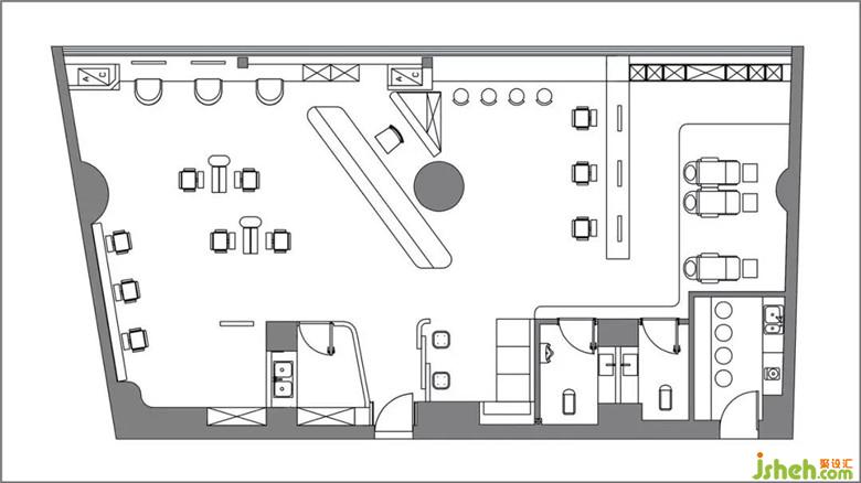 原始空间的入口处有一根直径一米的圆柱,我们设置了一个倾斜的巨大吧台,弱化了圆柱给这个空间所带来的拥堵感,圆柱也与吧台形态呼应,充分调和了空间比例关系,超长的吧台使得水吧与收银台一体化,大大增强了空间功能的多样性。