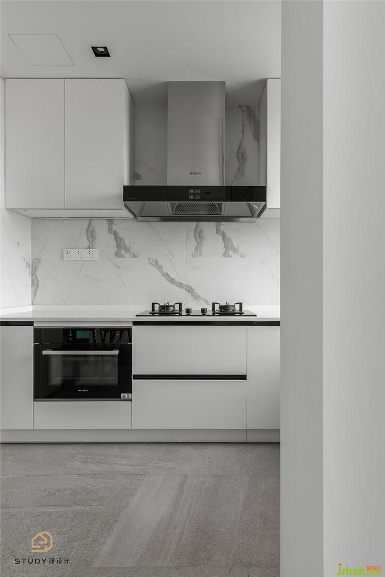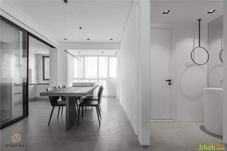 上吊轨的窄边框移门的使用让厨房不操作时保持开放状态,没有其它分割,与餐厅有了关系,无边框射灯让空间保持极简的统一。