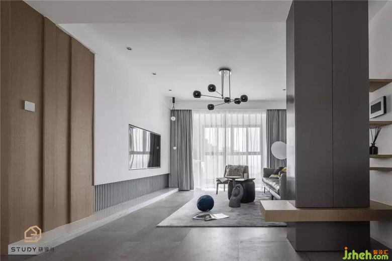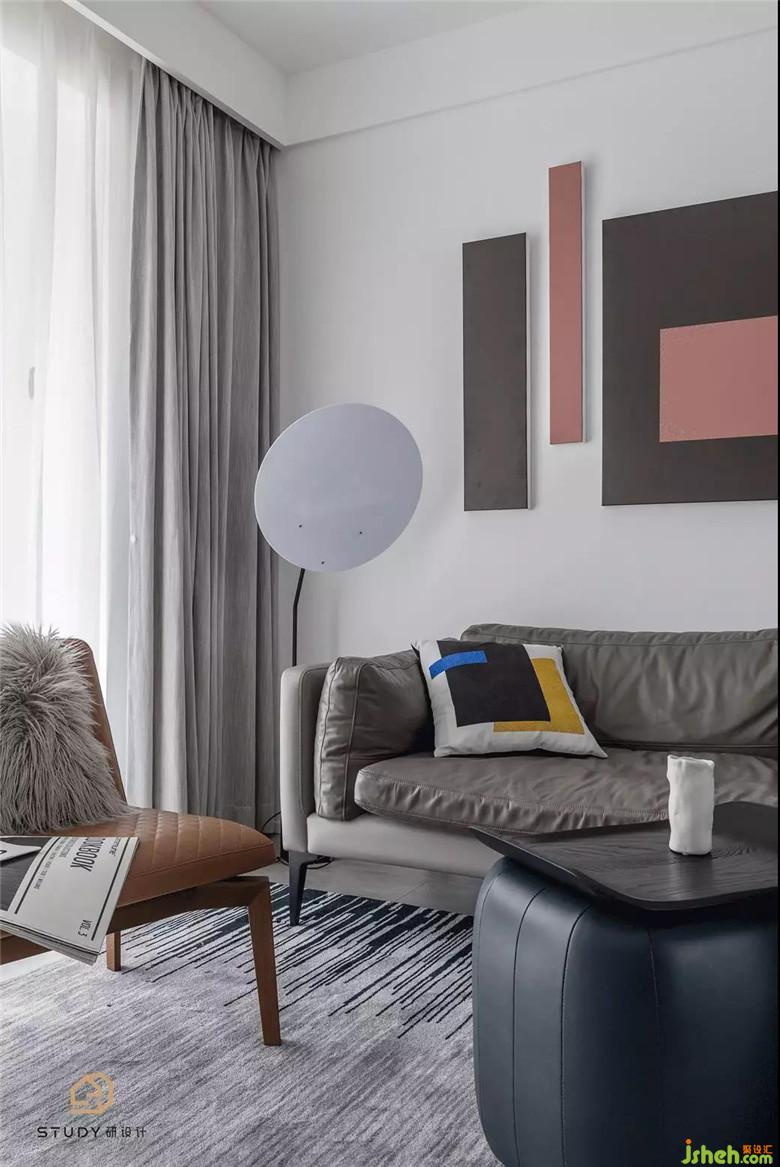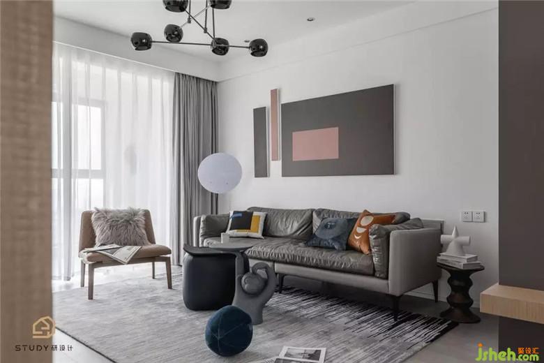 客厅空间室内设计师以清爽⼲净的⽩为主基调,温润的⽊⾊点缀其间,肌理柔和,仿佛把窗外的⾃然⽣机引⼊室内,灰⾊的⽪艺沙发为整个空间营造着简约的现代感。⼩猴⼦造型的举盘,趣味新颖,是客厅部分的幽默担当。
