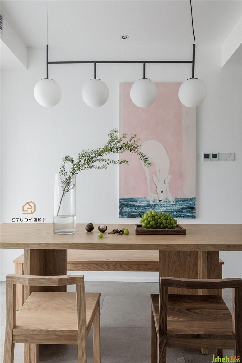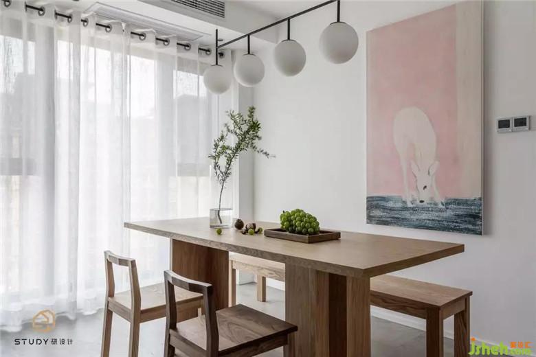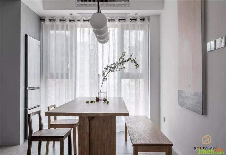⽊⾊餐桌餐椅与客厅相呼应,温润的⽊⾊在整个空间蔓延。