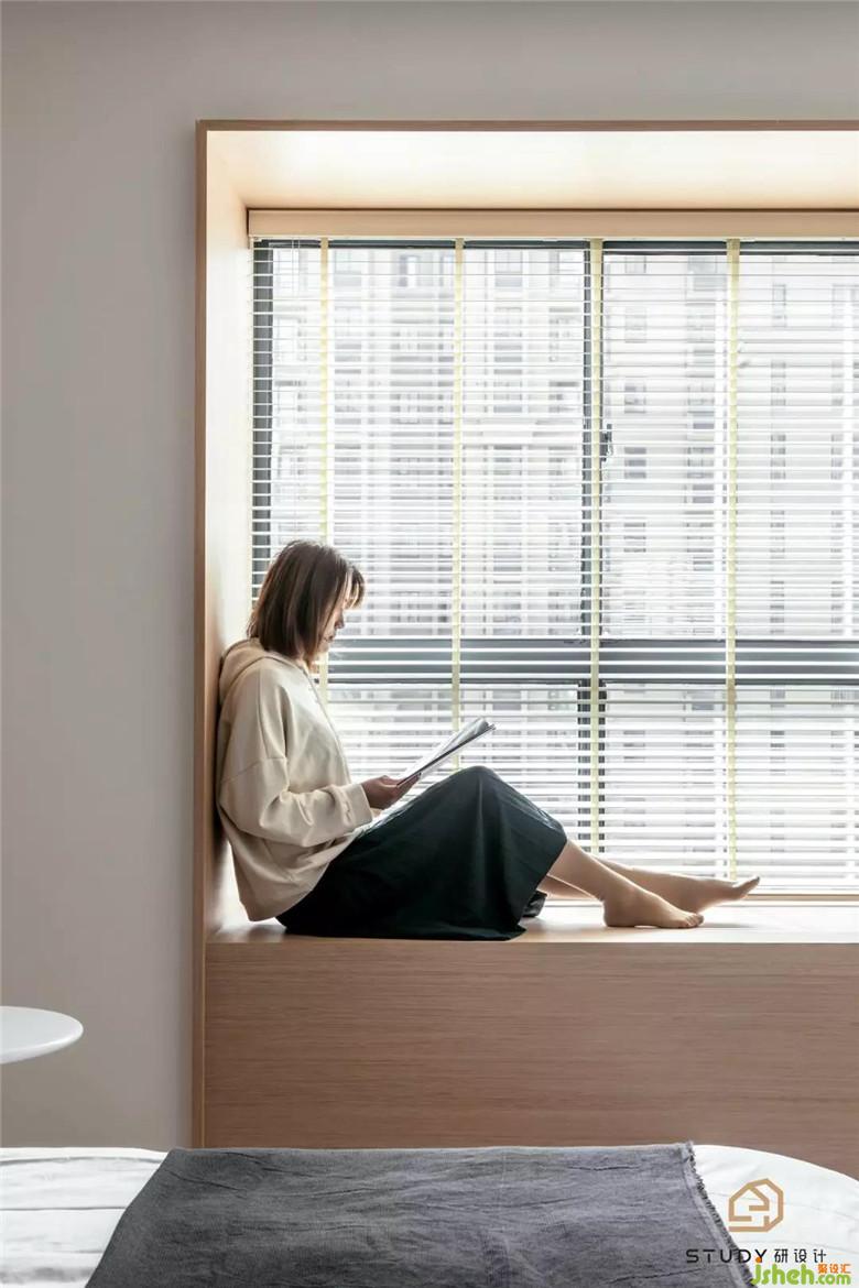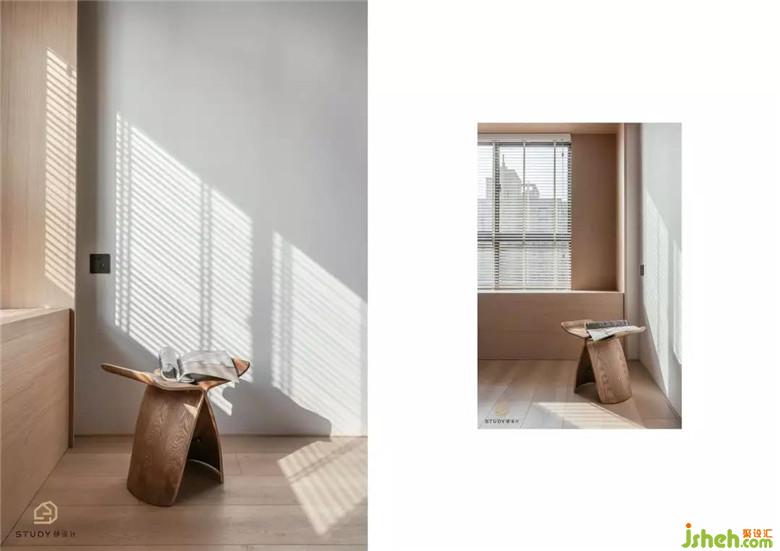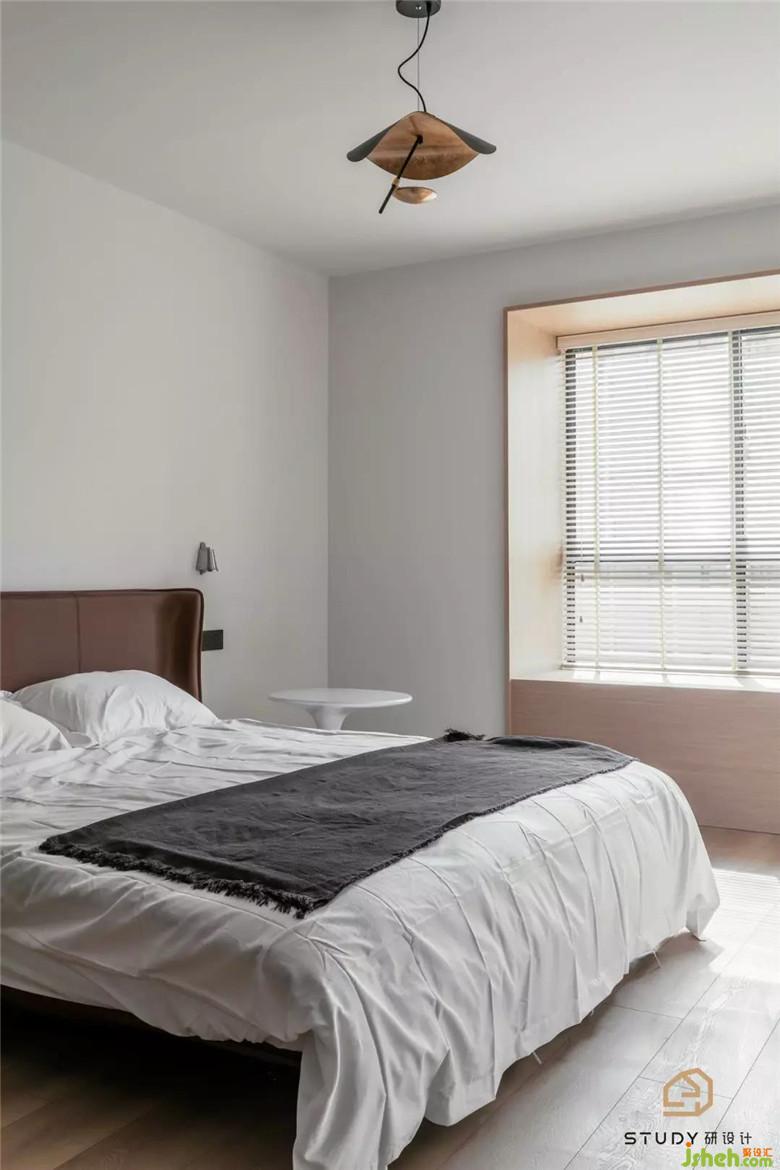沿着走廊走到最深处,明亮温柔的卧室就在这儿。有阳光的时候,墙面仿佛贴上了一张光影壁画,跟随百叶的调节改变心情。