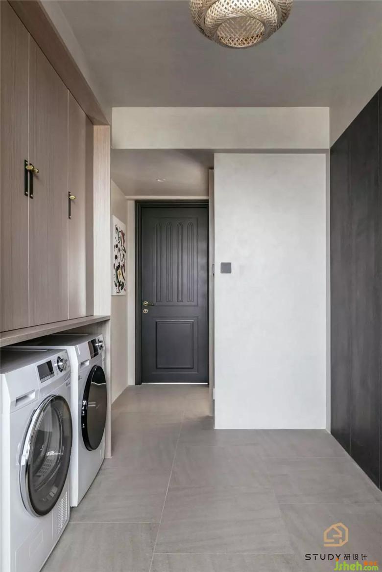 穿过客厅木制门洞,是连接衣帽间、主卧、和卫生间的走廊。米黄色马来漆与砂岩地砖的亲密接触,搭配木色及藤编,诉说着这正是曾经经历过的美好生活碎片。卧室房门的造型来源于欧洲某教堂。足够体量的衣帽间and洗衣房组合,生活不再奔波。