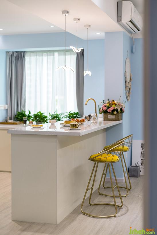 不能削掉柱子,结合吧台做造型。收掉凸角