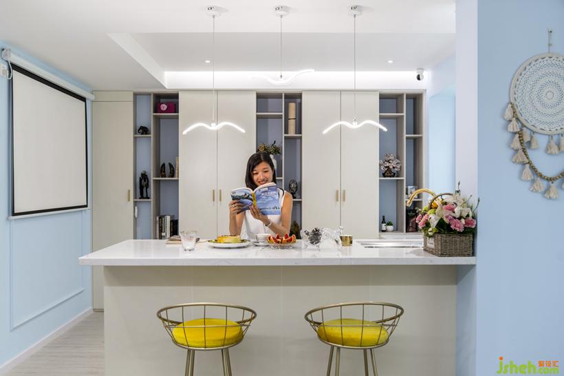 将收纳集中到柜体区,空出来桌面下方位置。保持通透清爽的视觉感受,方便打理卫生。