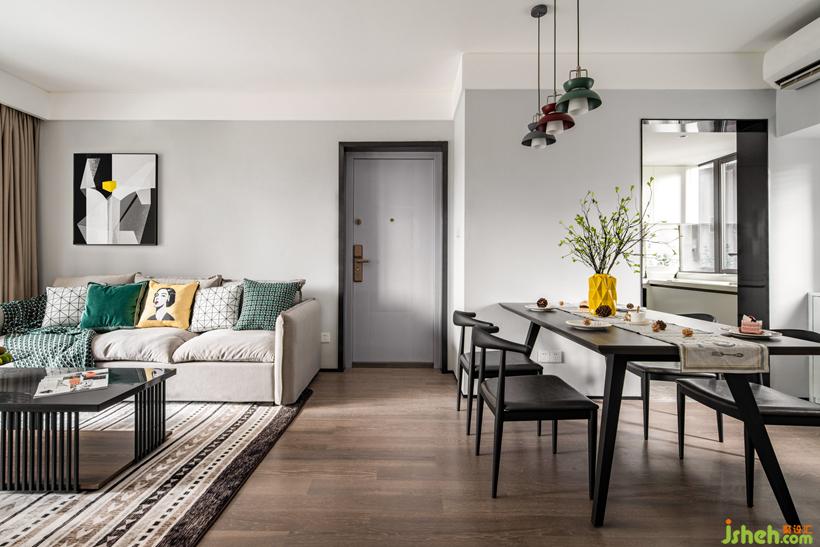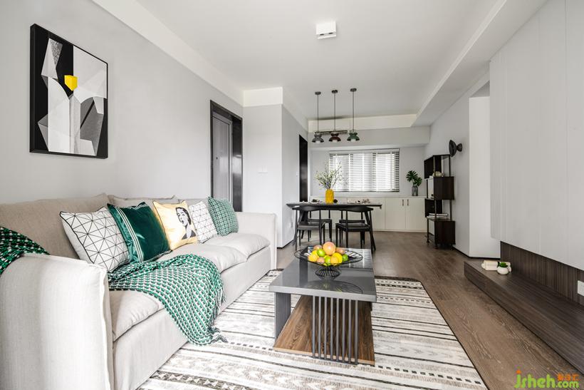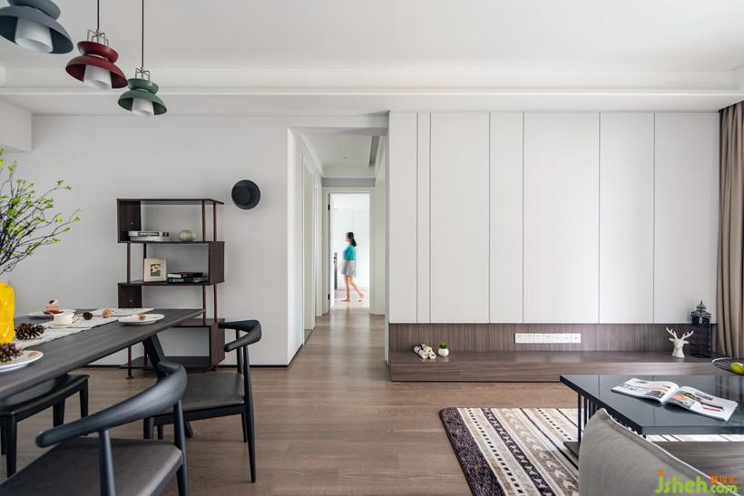 客厅:将鞋柜设置在门外,开放式书房设计,品质感大增。