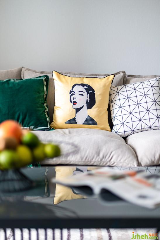 光面的黄色抱枕、绒面的墨绿抱枕、搭配经典格子纹案。